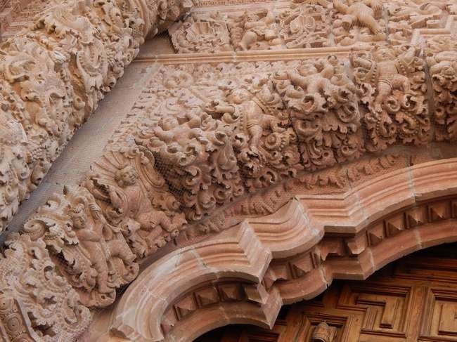 En este articulo abordamos parte de la arquitectura interior de la catedral y nos referimos a las piezas claves también llamadas dovelas, que están en la parte de en medio de los enormes arcos y también en medio de las ventanas. En total son 84 piezas claves y llevan la parte central custodiada por dos paralelos tallados de la hermosa cantera rosada de la región Zacatecana. Las piezas claves ocupan todos los espacios y las esculturas están moldeadas con detalles exquisitos. Al momento de esculpirlas, todas estaban pintadas con pan de oro y plata, otras de minerales como el cinabrio, lapislázuli, etcétera. Desde la portada principal de la Catedral Basílica de Zacatecas, hasta lo que hay adentro, en este caso sería la nave del Evangelio lo que vamos a abordar.