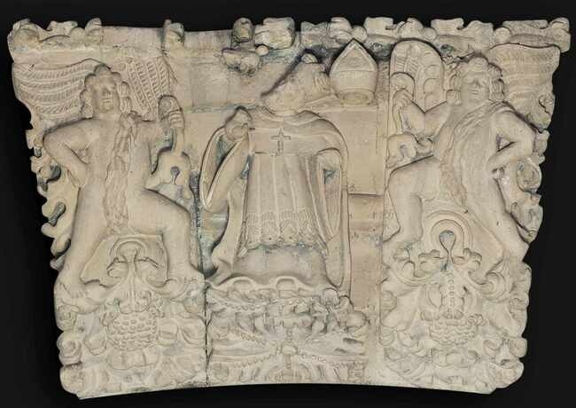 Son tres piezas separadas, en la central está el santo y flanqueado por dos grandes ángeles. Esta composición abundante en su iconografía tiene tres figuras erguidas. Destaca por su riqueza iconográfica y su magistral talla de cantera rosada en alto relieve, organizada en torno a un eje vertical marcado que guía la mirada hacia los elementos centrales. En el núcleo de la composición se alza la figura del mártir San Dionisio (Denis) representado con un dramatismo conmovedor: su cabeza decae casi sobre el hombro, evocando su martirio según la tradición, fue decapitado en Montmartre. A ambos lados, dos ángeles monumentales lo custodian, portando los atributos episcopales y martiriales del santo, como su báculo pastoral o la palma del martirio, reforzando su identidad sagrada y del cuello pende una cadena torzal con una cruz latina papal de un solo brazo, distintivo de su autoridad.