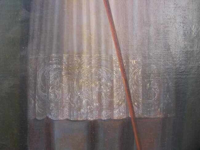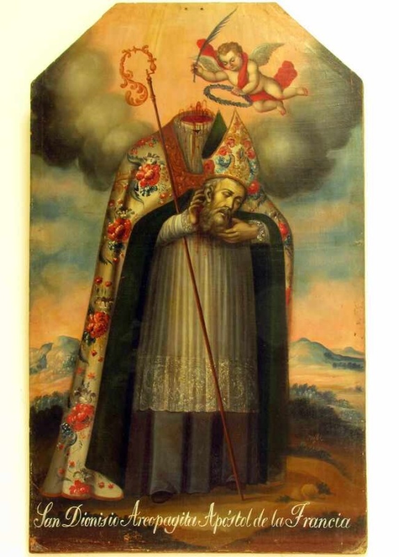 La inclinación de la cabeza no es solo un detalle realista, sino más bien a una alusión directa a su martirio según la tradición, tras ser decapitado en Montmartre. Dionisio recogió su propia cabeza y caminó hasta su sepultura convirtiéndose en uno de los cefalóforos (santos sin cabezas) más venerados. Por ello, en el arte suele representarse sosteniendo su cabeza entre las manos, aunque aquí el gesto hacia la paloma sugiere una variante iconográfica que enfatiza su conexión con lo divino.