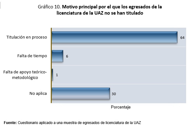 El motivo principal por el que los egresados de los PA de Licenciatura de la UAZ no se han titulado, es que la titulación está en proceso para el 64%, por falta de tiempo para el 6%, falta de apoyo teórico-metodológico 1% y para el 30% no aplica.