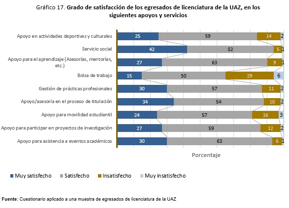 Los estados tanto en México como en Estados Unidos donde laboran los egresados de las licenciaturas de la UAZ son los siguientes: 26% Zacatecas, 1% Jalisco y Aguascalientes, 0.3% CDMX y Nuevo León, 0.2% Guanajuato, Chihuahua y San Luis Potosí, 0.1% Coahuila, Durango, México, Puebla, Monterrey, Sinaloa, Chicago, Nayarit, Quintana Roo y Sonora, 0.03% Baja California Sur, California, Colorado, Hidalgo, León, Michoacán, Montreal, Ohio, Querétaro, Tamaulipas, Texas y Virginia.