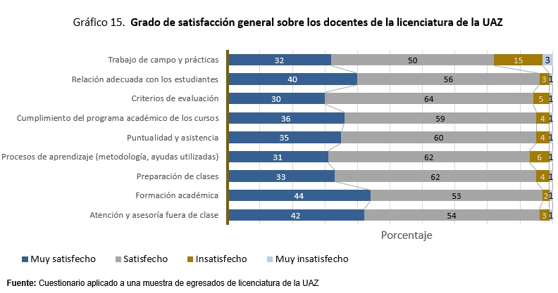 El medio por el que los egresados se enteraron de las licenciaturas, fue por información general de la UAZ para el 38%, por xxpo-orienta 20%, por referencia de amigos 12%, por referencias familiares 11%, por referencia de un egresado de la licenciatura y por búsqueda en Internet 8% respectivamente y otra 3%. El grado de satisfacción general sobre los docentes de los PA de Licenciatura de la UAZ, medida en muy satisfecho, satisfecho, insatisfecho y muy insatisfecho, obtuvo los siguientes resultados: