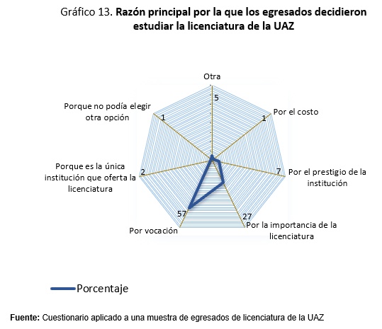 En lo que respecta al tiempo en el que planean titularse los egresados que aún no lo han hecho, el 60% lo hará en menos de 6 meses, 8% De 6 a 12 meses, 2% no sabe y para el 30% no aplica. La razón principal por la que los egresados de los PA de Licenciatura de la UAZ decidieron estudiar: superación personal 74%, obtener un mejor empleo 20%, otra 5% y tradición de familia 1%. En lo que refiere a la razón principal por la que los egresados decidieron estudiar los PA de Licenciatura de la UAZ, fue por vocación el 57%, por la importancia de la licenciatura 27%, por prestigio de la institución 7%, otra 5%, porque es la única institución que oferta la licenciatura 2%, por el costo y porque no podía elegir otra opción 1% respectivamente.