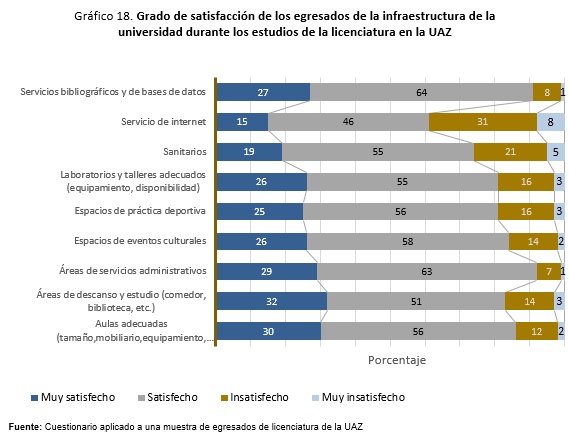 Referente al grado de satisfacción de la infraestructura de la universidad durante los estudios de Licenciatura en la UAZ, se percibió lo siguiente: