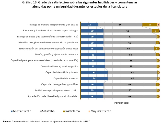 En lo referente al grado de satisfacción sobre las siguientes habilidades y competencias atendidas por la universidad durante los estudios de la licenciatura, dio los siguientes resultados: