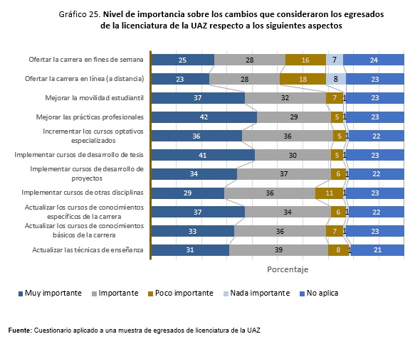 En lo referente al nivel de importancia medido en Muy importante, Importante, Poco importante, Nada importante y No aplica, sobre los cambios que consideraron los egresados, se obtuvo lo siguiente:
