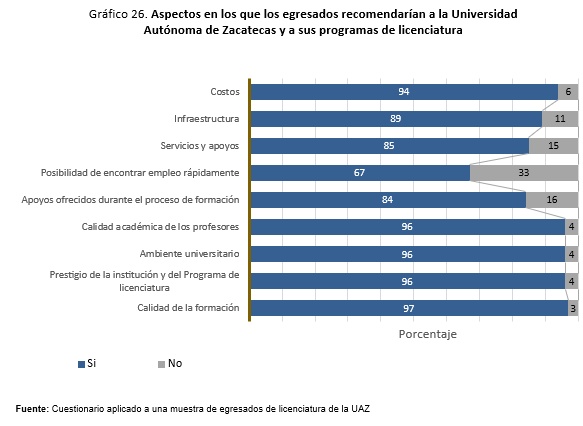 Dentro de los aspectos en los que los egresados recomendarían a la Universidad Autónoma de Zacatecas y a sus Programas Académicos de Licenciatura, evaluando afirmativa o negativamente, se observó: