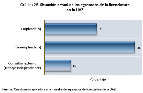 La situación actual de los egresados de las licenciaturas es de Desempleada(o) 53%, Empleada (o) el 31%, Consultor externo (trabajo independiente) 16%.