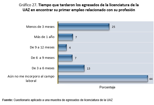 En lo que respecta al tiempo que tardaron los egresados de las licenciaturas de la UAZ en encontrar su primer empleo relacionado con su profesión, el 25% lo hizo en Menos de 3 meses, 13% De 3 a 6 meses, Más de un año y De 6 a 9 meses 7% respectivamente, 4% De 9 a 12 meses y 44% Aún no se incorpora al campo laboral.