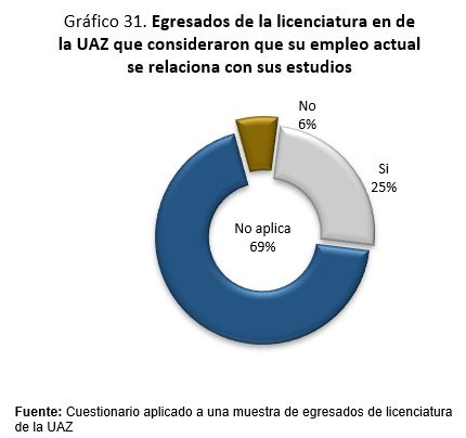 El 25% de las y los egresados considera que su empleo actual se relaciona con sus estudios, el 6% no lo considera de esta manera. El giro comercial de la empresa u organización donde laboran actualmente los egresados de las licenciaturas de la UAZ, es de Servicios para el 23%, Comercio para el 4% e Industria con el mismo porcentaje.