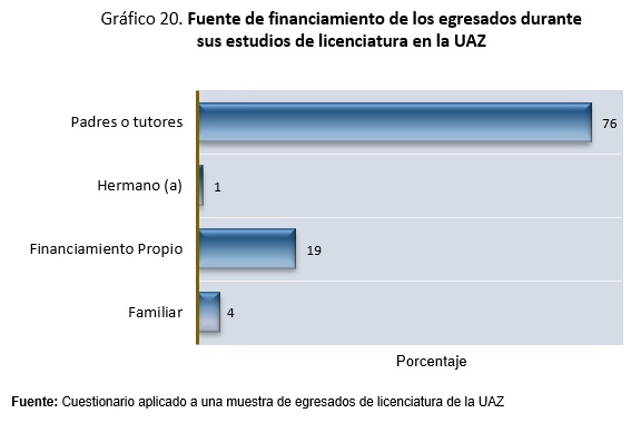 La fuente de financiamiento durante los estudios de licenciatura de los egresados provino de Padres o tutores para el 76%, Financiamiento propio 19%, Familiar 4% y Hermano (a) 1%.