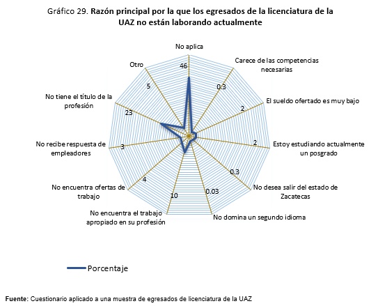 Acerca de la razón principal por la que los egresados de los Programas Académicos de Licenciatura de la UAZ no están laborando actualmente, el 23% porque No tiene el título de la profesión, 10% No encuentra el trabajo apropiado en su profesión, 5% Otro, 4% No encuentra ofertas de trabajo, 3% No recibe respuesta de empleadores, El sueldo ofertado es muy bajo y Está estudiando actualmente un posgrado 2%respectivamente, 0.3% No desea salir del estado de Zacatecas y Carece de las competencias necesarias en las dos categorías, 0.03% No domina un segundo idioma y para 46% No aplica.