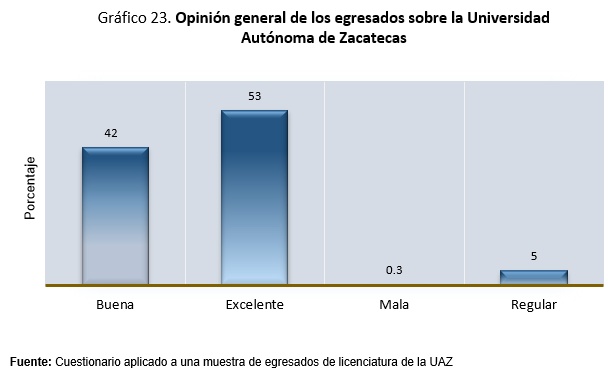 Acerca de la opinión general de los egresados sobre la Universidad Autónoma de Zacatecas, 53% la considera Excelente, 42% Buena, 5% Regular y .3% Mala.