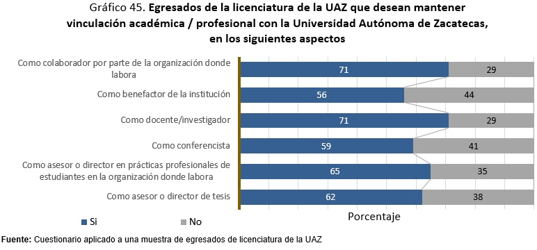 Acerca de las y los egresados de las licenciaturas de la UAZ que desean mantener vinculación académica / profesional con la Universidad Autónoma de Zacatecas en los aspectos a mencionar, evaluando en una respuesta afirmativa o en una respuesta negativa, se observó lo siguiente: